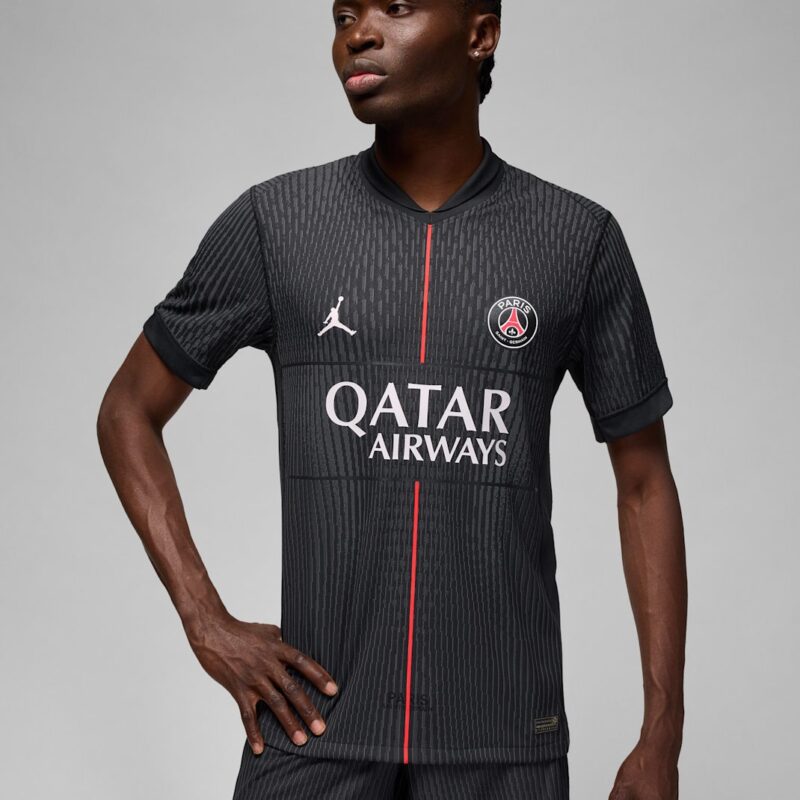 Principalement noir, accompagné de touches de gris anthracite et de nuances de rose, le nouveau maillot se distingue par une ligne centrale rouge traversant verticalement la tunique, clin d’œil contemporain et subtil à un design fondateur du PSG. Cette fine bande évoque le trait esquissé sur un patron d’atelier ou un tableau noir. La tenue arbore également des contrastes subtils et des effets uniques sur l’ensemble du tissu. Enfin, un col soigné et des coutures apparentes allient élégance et technicité.