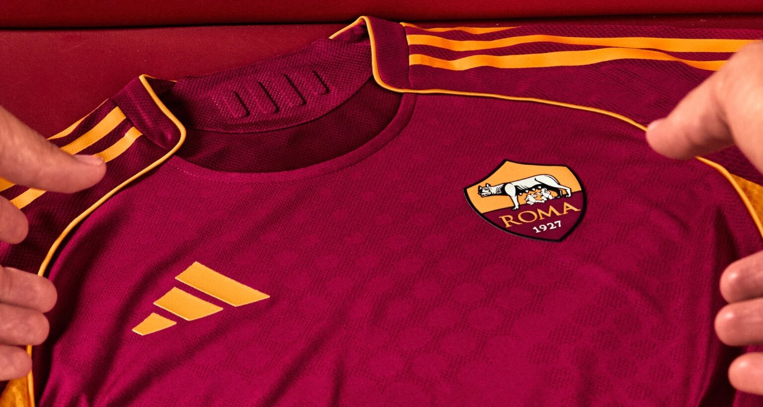 Le maillot arbore un rouge foncé tirant légèrement sur le bordeaux sur l’ensemble du tissu, avec du jaune sur le logo de l’équipementier allemand, les bordures et les bandes iconiques disposées sur les épaules. Ce coloris doré est également présent sur l’inscription « AS ROMA » en haut du dos.