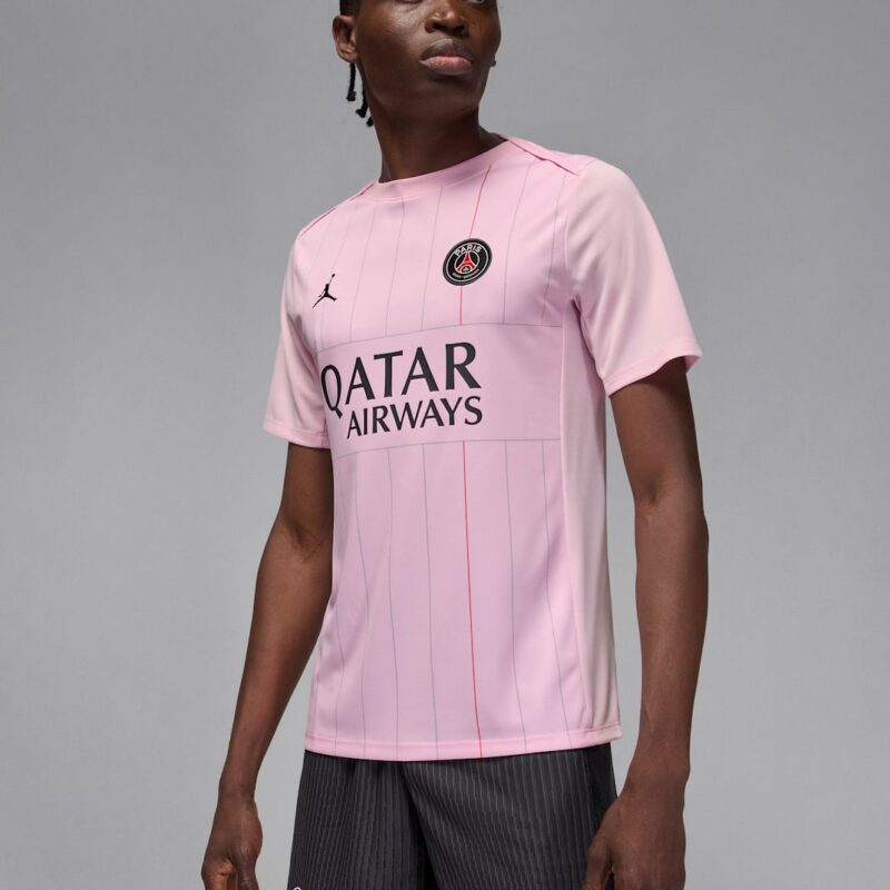 À l’occasion du lancement de son quatrième maillot pour la saison 2025-2026, le Paris Saint-Germain dévoile une nouvelle tenue pré-match en collaboration avec Jordan Brand. Cette tunique se distingue par sa couleur principale : un rose pâle audacieux, offrant un rendu original et rarement arboré par le club de la capitale.