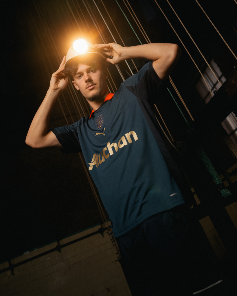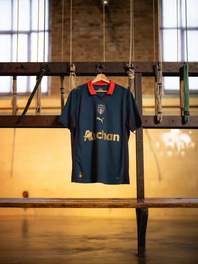 La tenue arbore un bleu profond, inspiré du bleu de travail porté par les ouvriers des mines de charbon. Ce maillot est sublimé par un col rouge, clin d’œil aux codes vestimentaires des mineurs, ainsi que par des flocages dorés rendant hommage à ces travailleurs dont le sacrifice et la bravoure forcent le respect.