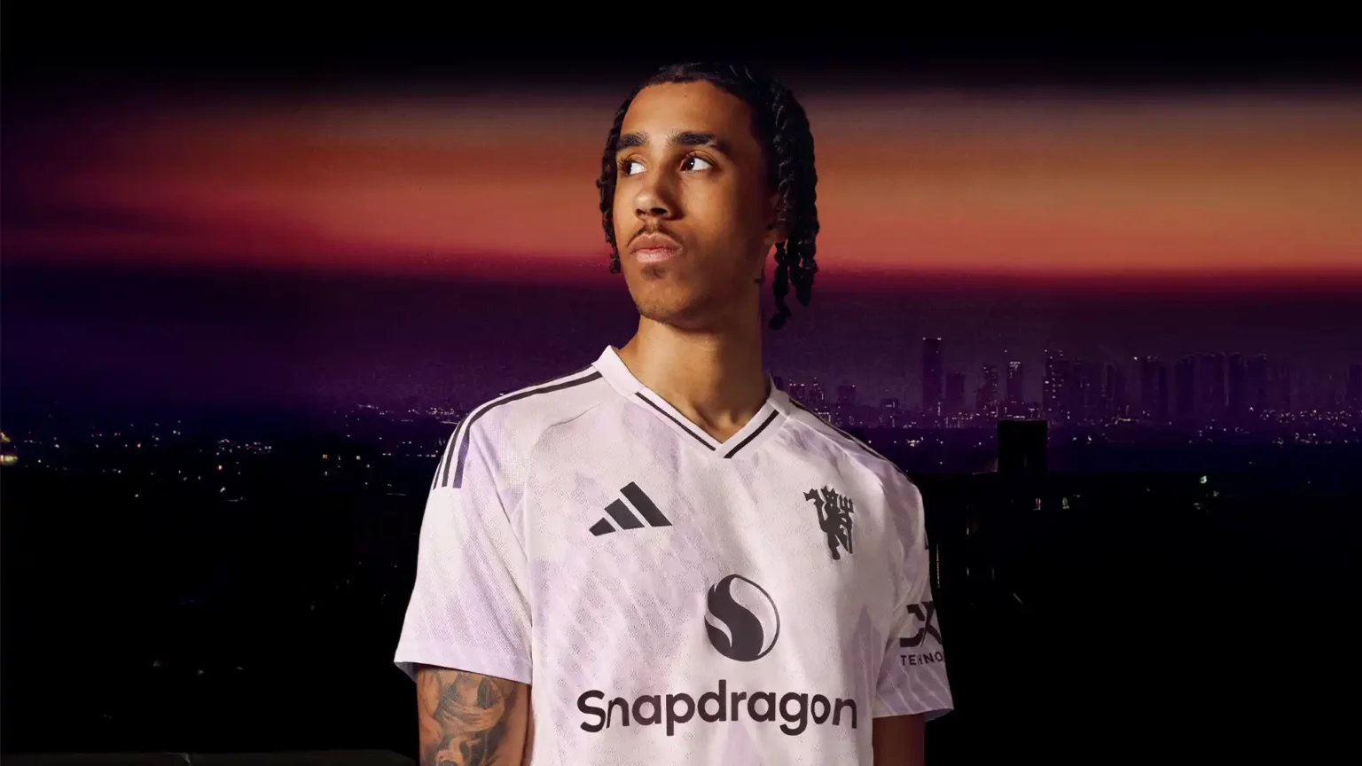 Le maillot, principalement blanc, est sublimé par un coloris lilas présent sur des motifs géométriques inspirés de l’emblématique graphisme des flocons de neige de la tenue portée par les joueurs du club mancunien en 1992. Ce design audacieux est accompagné de violet sur l’écusson revisité de Manchester United, sur le logo de l’équipementier allemand ou encore sur les trois bandes de chaque épaule. La tunique est complétée par un col en V.