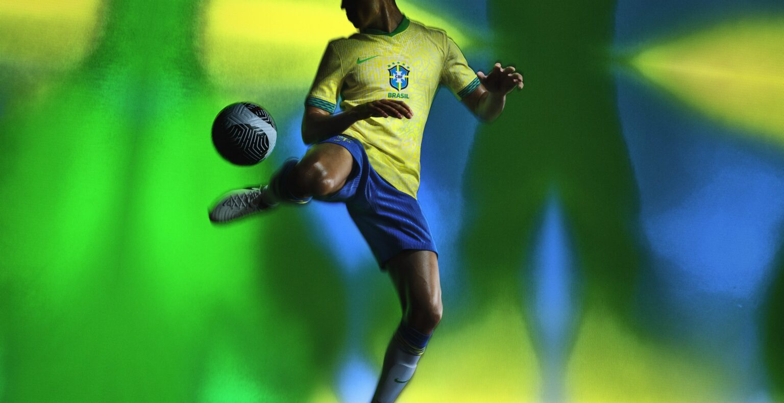 Le kit met en avant les couleurs emblématiques de la sélection brésilienne, combinant le jaune et le vert. La firme américaine a modernisé la tenue avec un imprimé intégral sur l’ensemble du tissu, puisant son inspiration dans l’architecture, la musique et la nature du pays. À l’intérieur du maillot, on trouve l’inscription « Brasil para todos ». Enfin, l’écusson de la Seleção est positionné au centre.